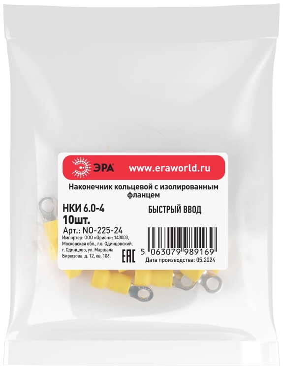 Наконечник кольцевой ЭРА NO-225-24 НКИ 6.0-4 с изолированным фланцем (упаковка 10 шт.)