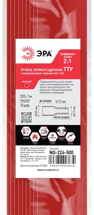 Термоусадочная трубка ЭРА NO-224-500 ТТУ нг-LS 35/17.5 красная в отрезках по 1 м. (упаковка 10 штук)