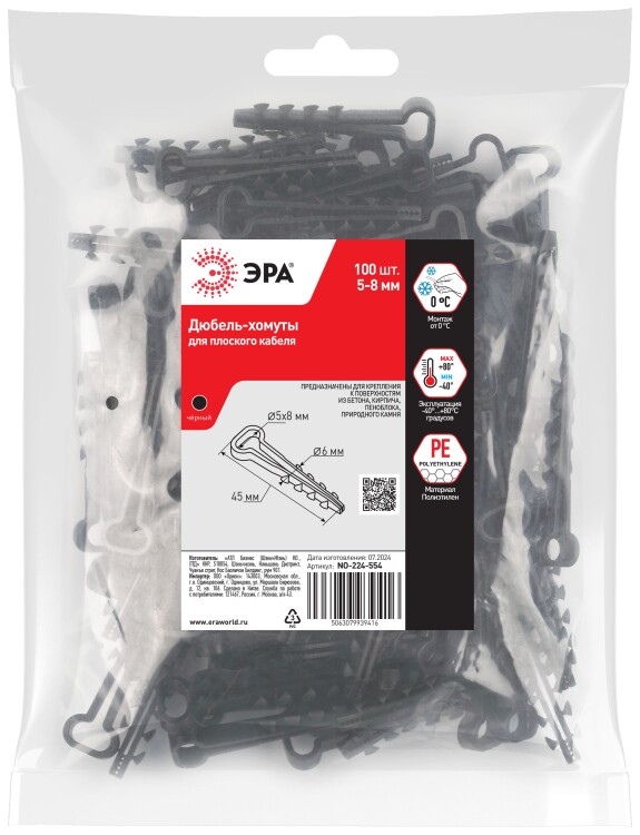 Дюбель хомут ЭРА NO-224-554 для плоского кабеля 5-8 мм чёрный (100 штук)