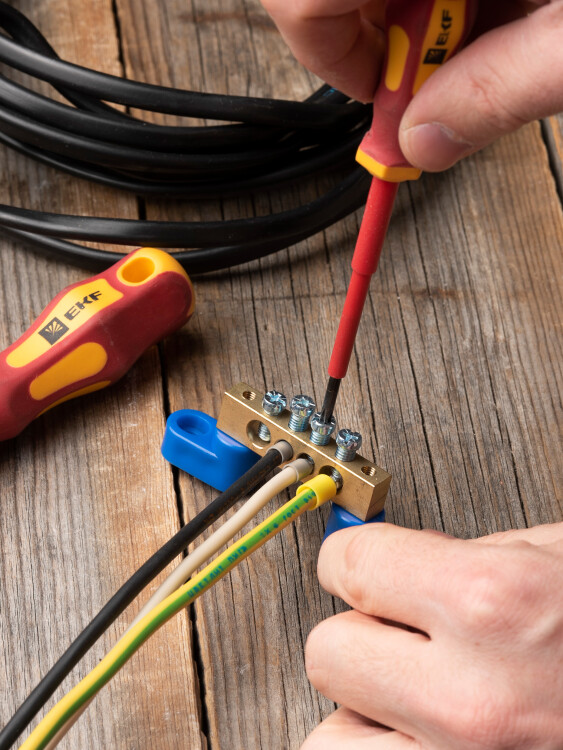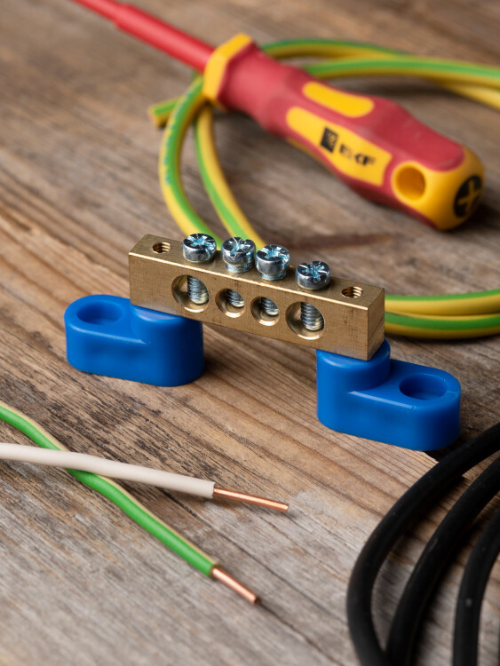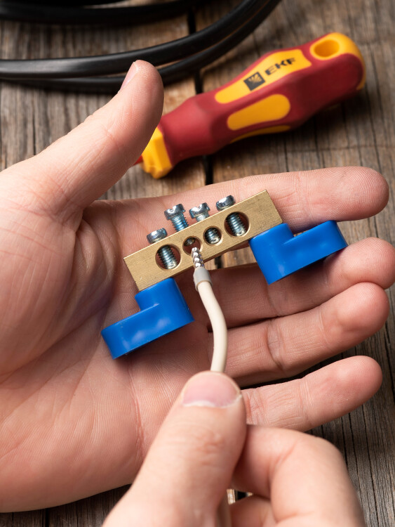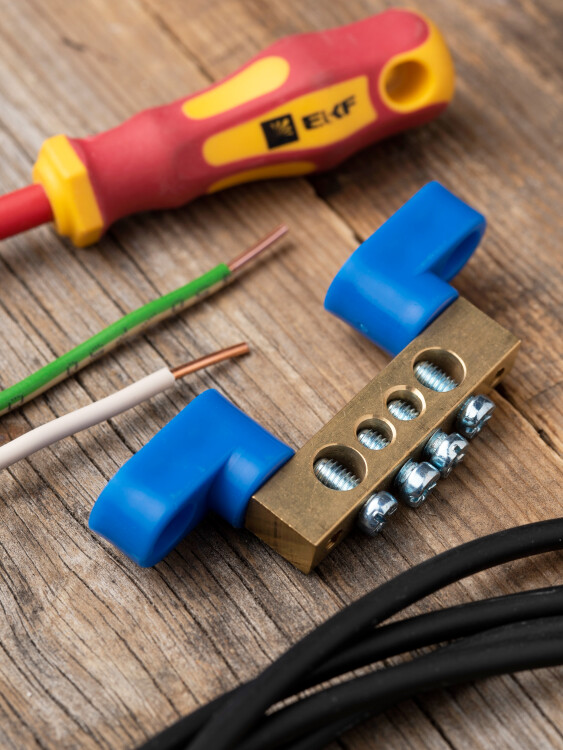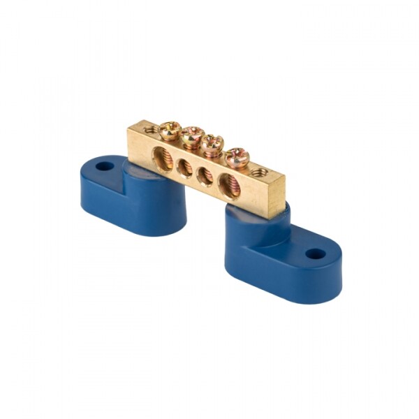 Шина "0" N (8х12мм) 4 отверстия латунь 2 синих угловых изолятора EKF PROxima
