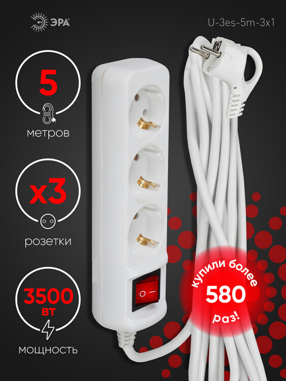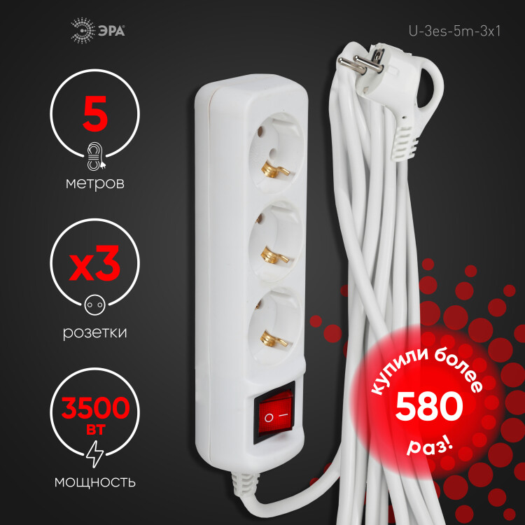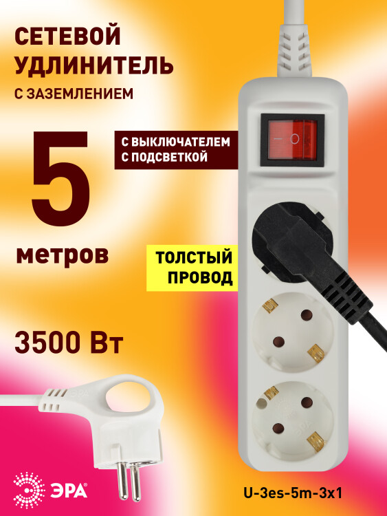 Удлинитель,3розетки, длина 5 м, 16А, ПВС 3х1 мм?, с/з, IP20, пластик, белый, U-3es-5m