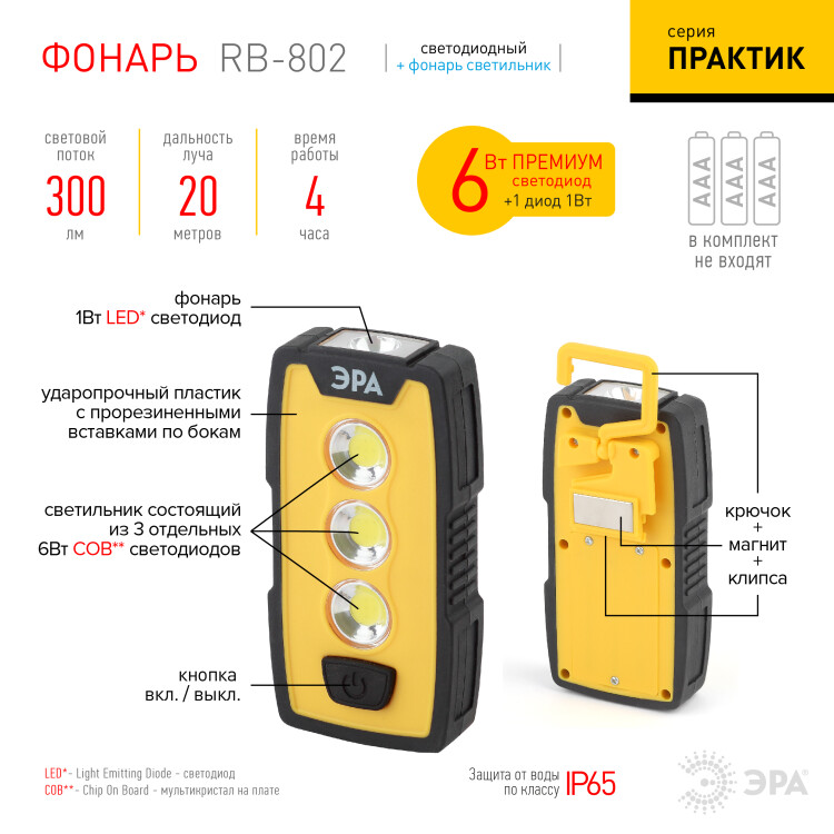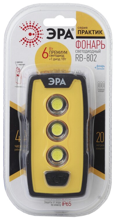 Светодиодный фонарь ЭРА Рабочие Практик RB-802 ручной на батарейках IP65 магнит с крючком и клипсой