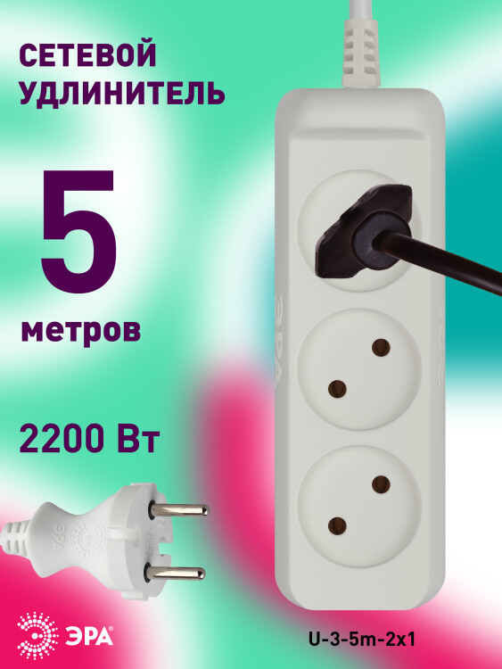 Удлинитель,3розетки, длина 5 м, 10А, ПВС2х1мм?, б/з, IP20, пластик, белый, 10АU-3-5m
