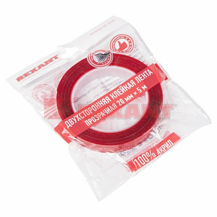 Двуxсторонний скотч, акриловая основа, прозрачный, 20мм, ролик 5м REXANT
