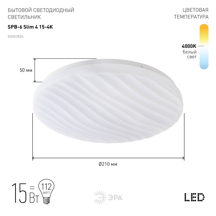 Светильник потолочный светодиодный ЭРА Slim без ДУ SPB-6 Slim 4 15-4K 15Вт 4000K