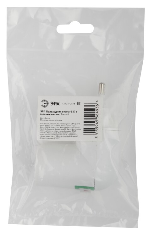 Переходник-вилка ЭРА Е27 с выключателем пластиковый белый