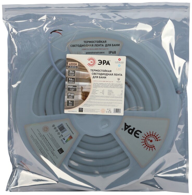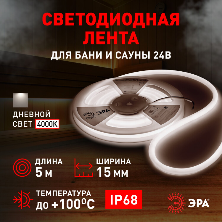 Лента светодиодная термостойкая для бани ЭРА LS2835-9,6-120-24-4000K-IP68-3 year-5m (дневной белый)