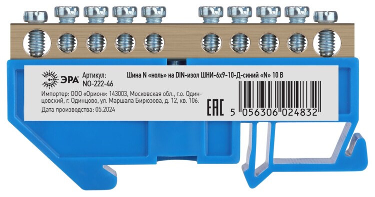 Шина ЭРА NO-222-46 N ноль на DIN-изоляторе ШНИ-6х9-10-Д-синий