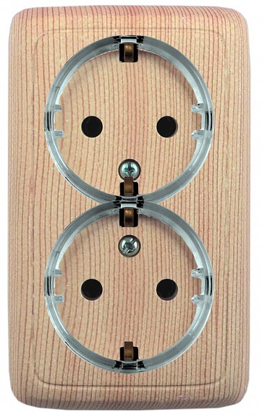 РА16-184-02 Розетка открытой установки, двухместная, с заземляющим контактом, со шторками, с изолирующей пластиной, цвет сосна