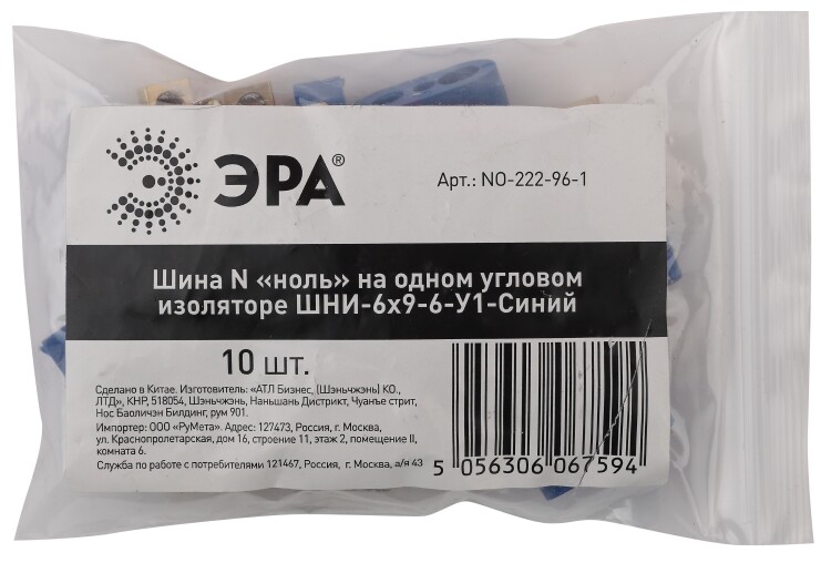 Шина ЭРА NO-222-96-1 N ноль на одном угловом изоляторе ШНИ-6х9-6-У1-Синий