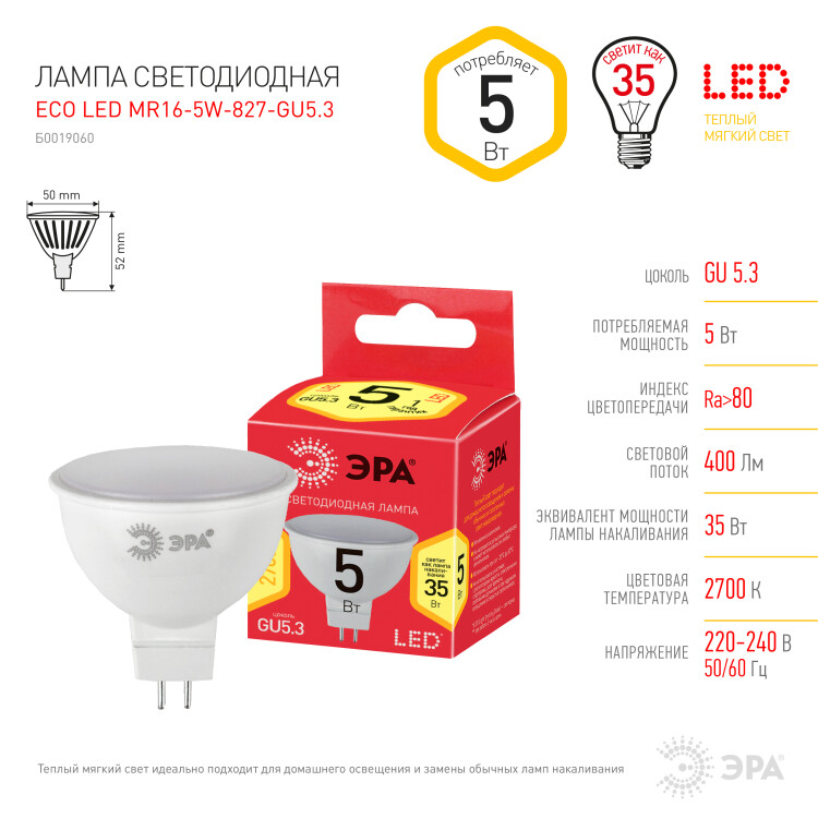 Лампочка светодиодная ЭРА RED LINE ECO LED MR16-5W-827-GU5.3 GU5.3 5Вт софит теплый белый свет