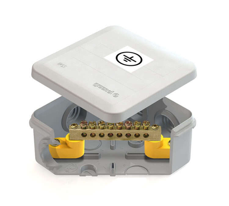 Коробка уравнивания потенциалов для открытой установки 100х100х50мм, 6 вводов, с шиной, IP55