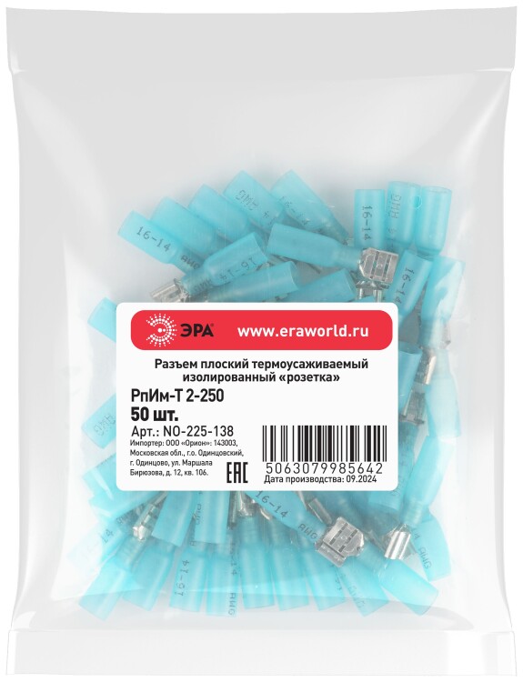 Разъем плоский термоусаживаемый ЭРА NO-225-138 РпИм-Т 2-250 изолированный «розетка» (упак. 50 шт.)