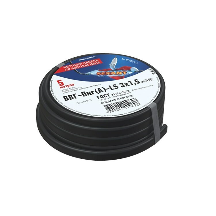 Кабель силовой медный ВВГ-Пнг(А)-LS 3x1,5 мм², длина 5 метров, ГОСТ 31996-2012, ТУ 16.К71-310-2001 REXANT
