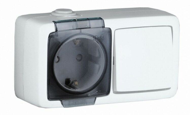 БА16-221 Блок открытой установки, брызгозащищенный , розетка с заземляющим контактом и шторками+одноклавишный выключатель, цвет белый