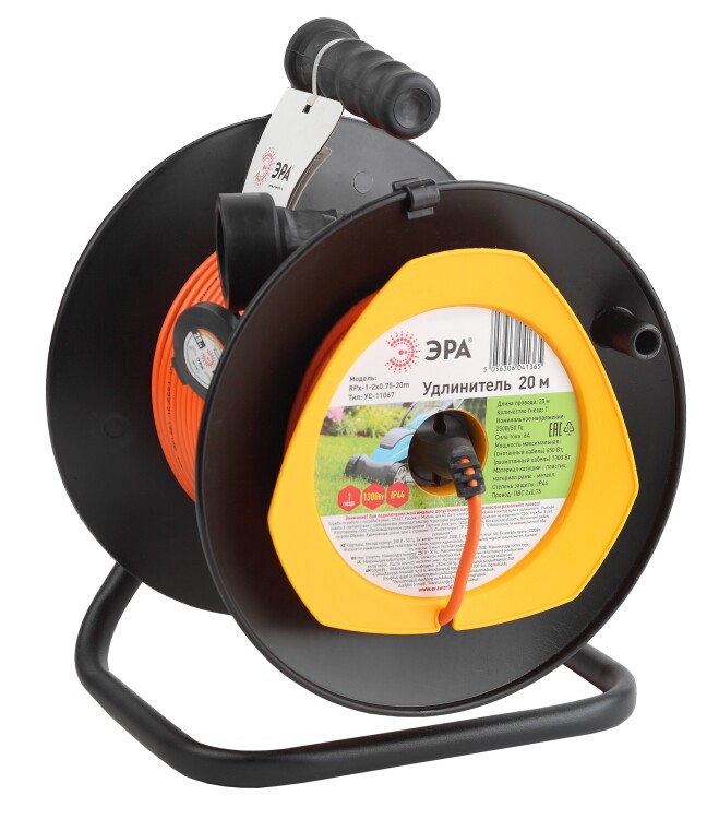 Удлинитель на катушке, 1 розетка, длина 20 м, 6А, ПВС 2х0.75 мм², б/з, IP44, пластик, оранжевый