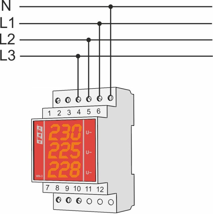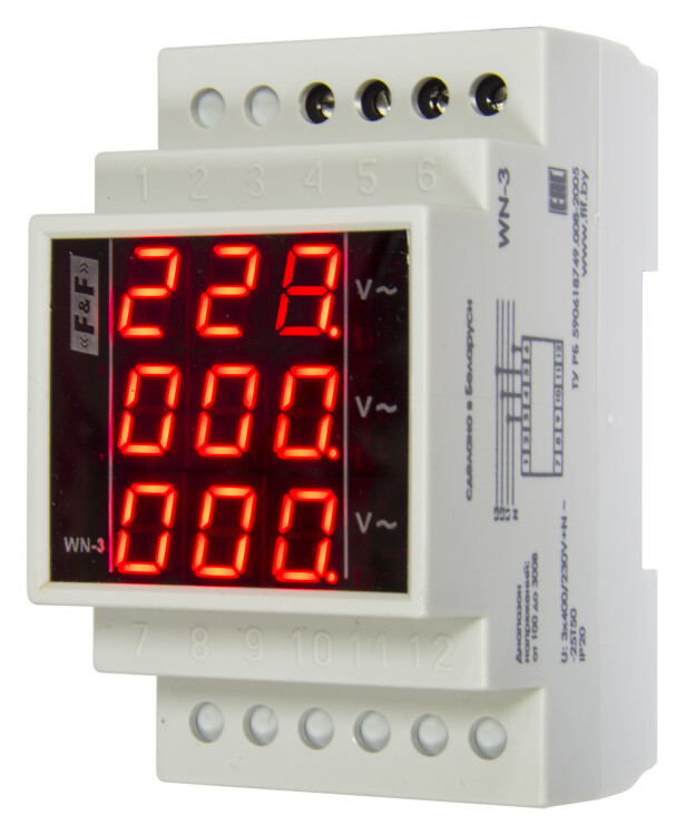 Указатель напряжения WN-3 (трехфазный; 20-450В отображает фазные или линейные напряжения; цифровая индикация; память миним. и макс. значения напряжения 3 мод. монтаж на DIN-рейке) F&F