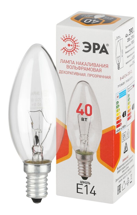 Лампочка ЭРА B36 40Вт Е14 / E14 230В накаливания свечка прозрачная