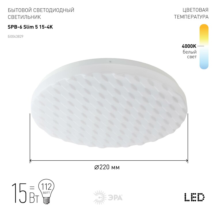 Светильник потолочный светодиодный ЭРА Slim без ДУ SPB-6 Slim 5 15-4K 15Вт 4000K 900Лм
