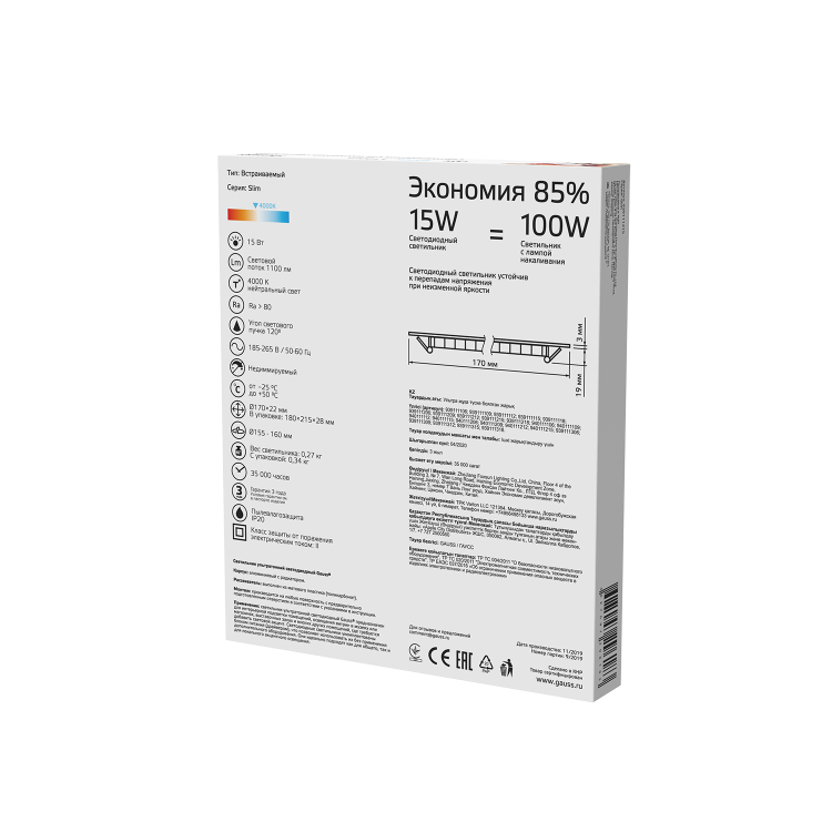 Светильник встр. LED 15Вт 1100Лм 4000К IP20 ультратонкий