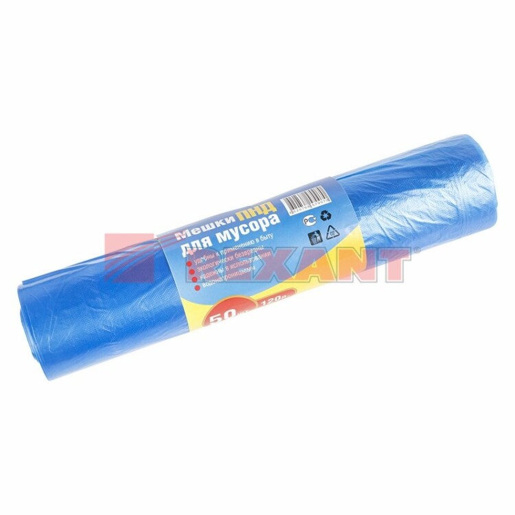 Мусорные мешки ПНД, размер 70 х 110 см, объём 120 литров, 50 шт. в рулоне, синий
