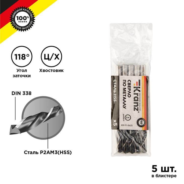 Сверло по металлу 8,0x117x75мм (HSS), DIN 338, 5 шт. в упаковке KRANZ