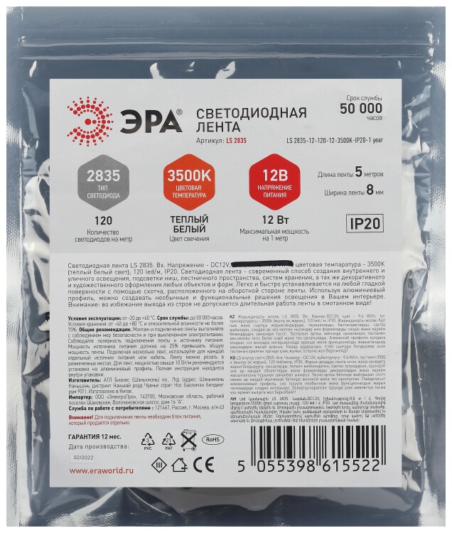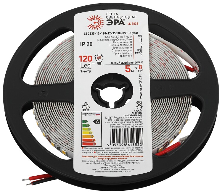 Светодиодная лента ЭРА LS2835 12-120-12-3500K-IP20-1 year-5m нейтральный белый свет