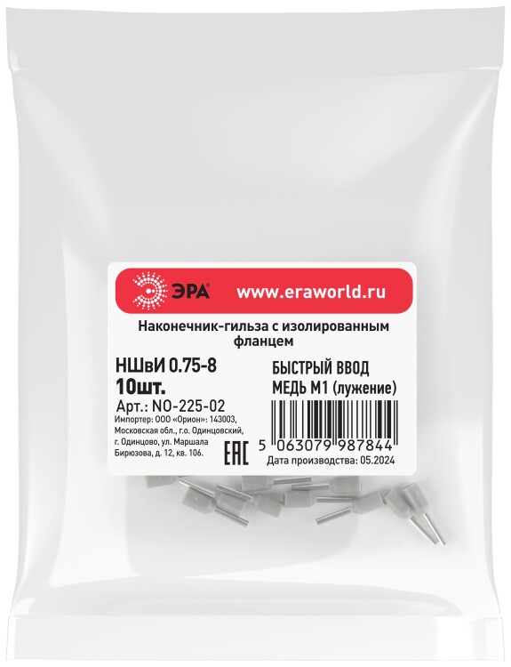 Наконечник-гильза ЭРА NO-225-02 НШвИ 0,75-8 с изолированным фланцем (упаковка 10 шт.)