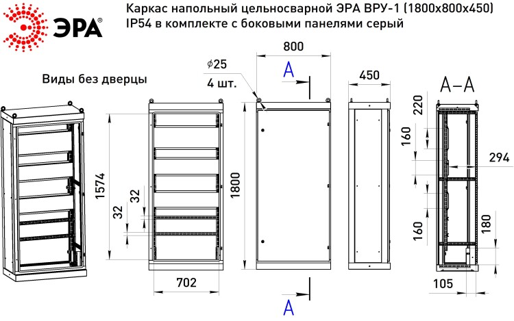 Каркас напольный цельносварной ЭРА ВРУ-1 (1800х800х450) IP54 в комплекте с боковыми панелями серый
