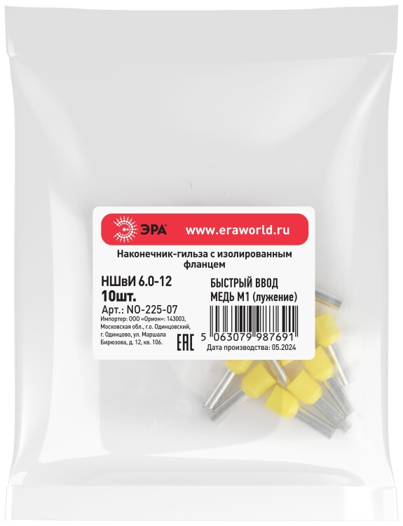 Наконечник-гильза ЭРА NO-225-07 НШвИ 6,0-12 с изолированным фланцем (упаковка 10 шт.)