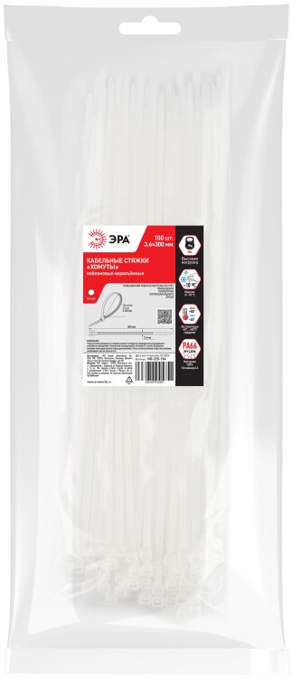 Кабельная стяжка ЭРА NO-225-154 (хомут) нейлоновая 3.6 х 300 мм белая (100 шт/уп)