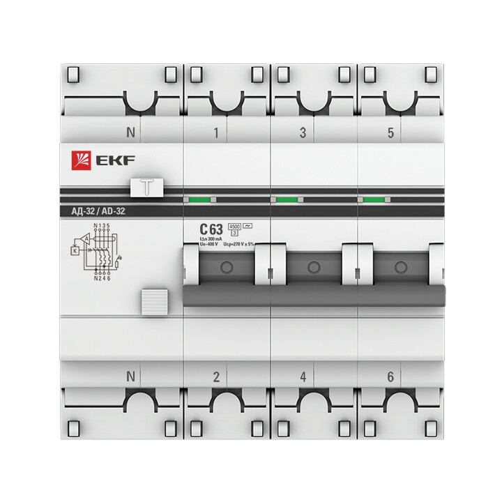 Автомат. выкл. дифф. тока 3-пол.+N 63А 300мА тип AC 4,5кА хар-ка C серия АД-32 3P+N 63А/300мА (хар. C, AC, электронный, защита 270В) 4,5кА EKF PROxi