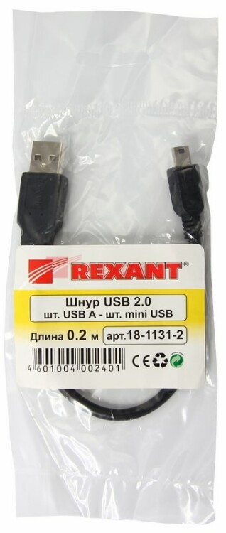 Кабель USB-A - mini USB, 1А, 0,2м, ПВХ, черный REXANT