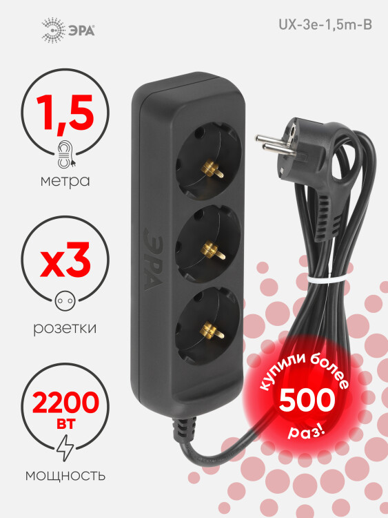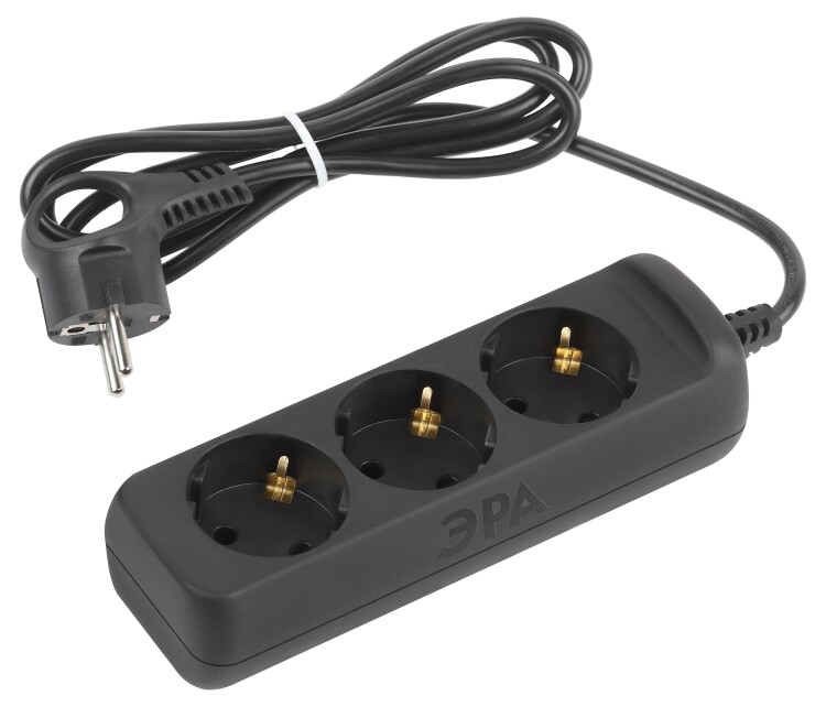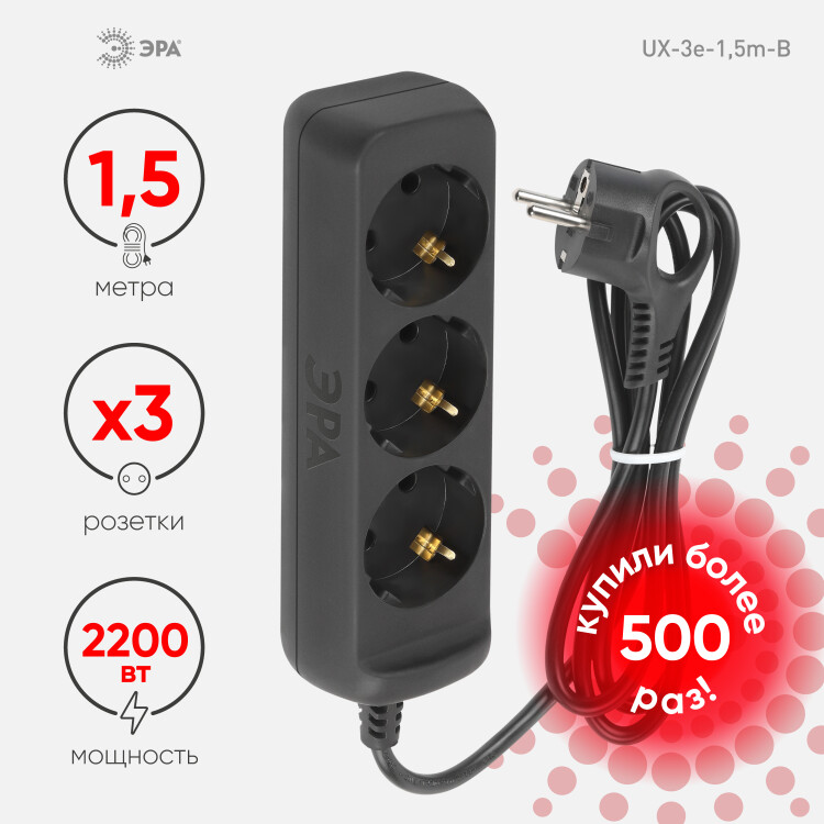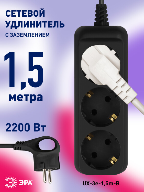 Удлинитель электрический ЭРА UX-3e-1,5m-B с заземлением 3 розетки 1,5 м ПВС 3x0,75мм2 10А черный