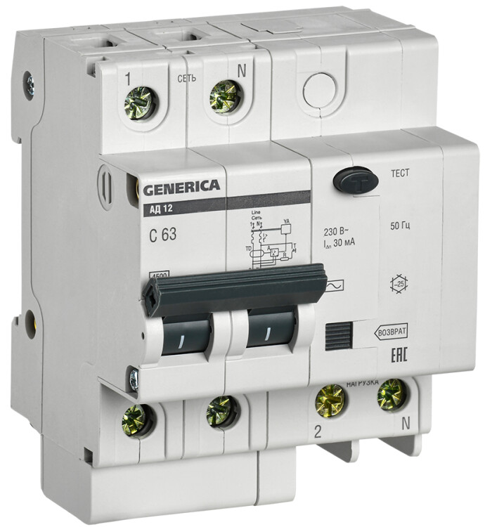 Диф. автомат АД12 2Р 63А 30мА GENERICA