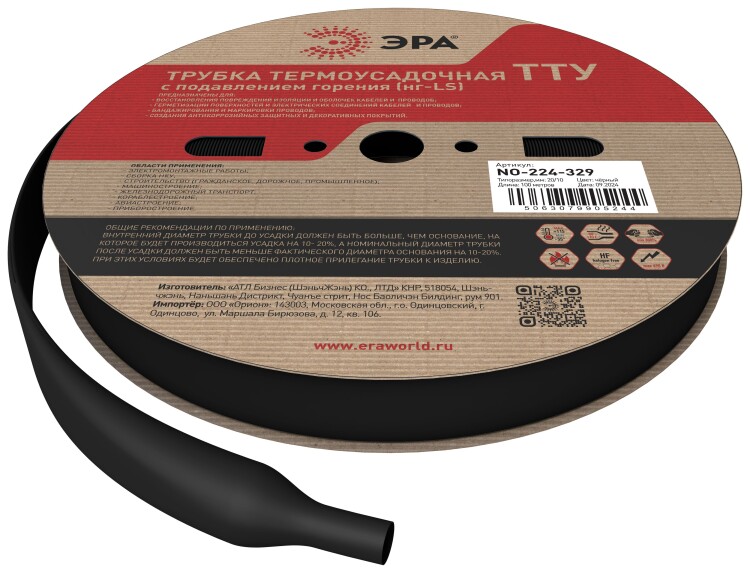 Термоусадочная трубка ЭРА NO-224-329 ТТУ нг-LS 20/10 чёрная (рулон 100 метров)