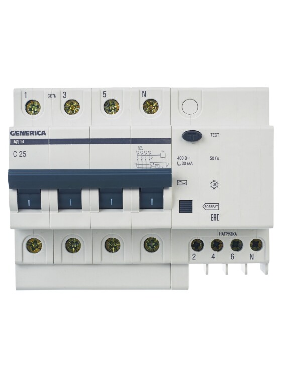 Диф. автомат АД14 4Р 25А 30мА GENERICA