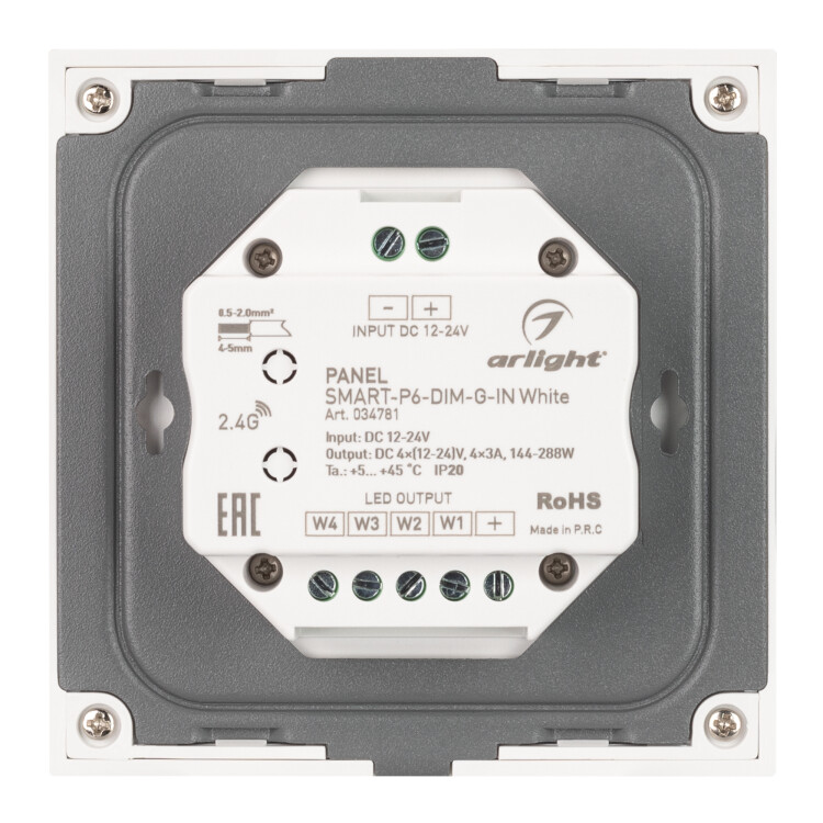 Панель SMART-P6-DIM-G-IN White (12-24V, 4x3A, Sens, 2.4G) (Arlight, IP20 Пластик, 5 лет)