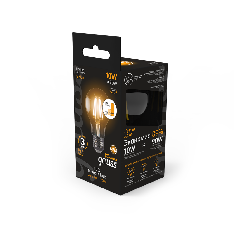Лампа светодиодная 10 Вт 230В E27 Filament A60-пошаговое диммирование тёплый 2700K