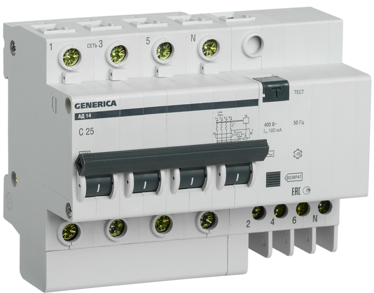 Диф. автомат АД14 4Р 25А 100мА GENERICA