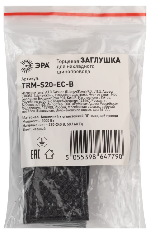 Заглушка ЭРА TRM-S20-EC-B торцевая для накладного магнитного шинопровода NOVA TRM-S20 черный
