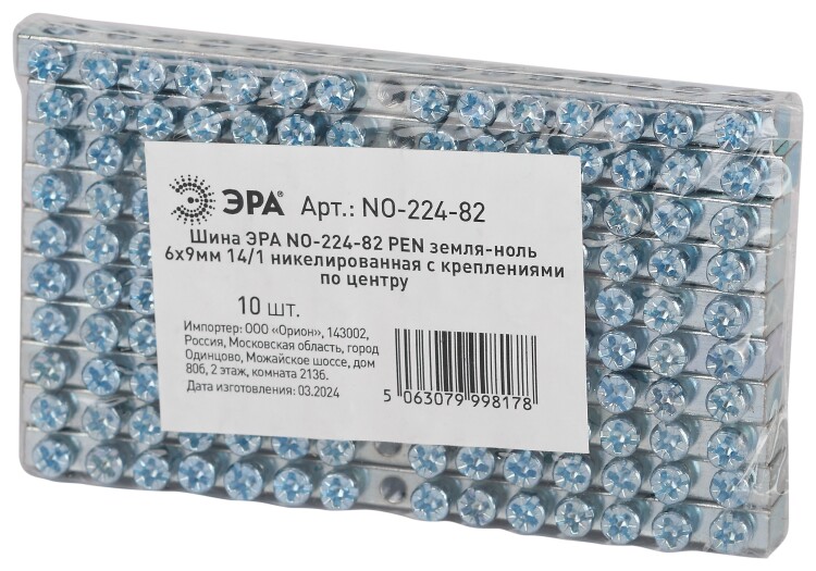 Шина ЭРА NO-224-82 PEN земля-ноль 6х9мм 14/1 никелированная с креплениями по центру