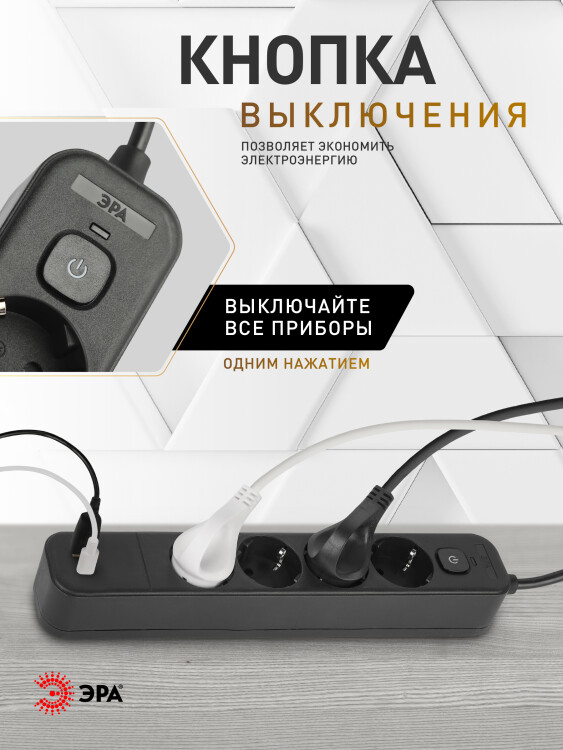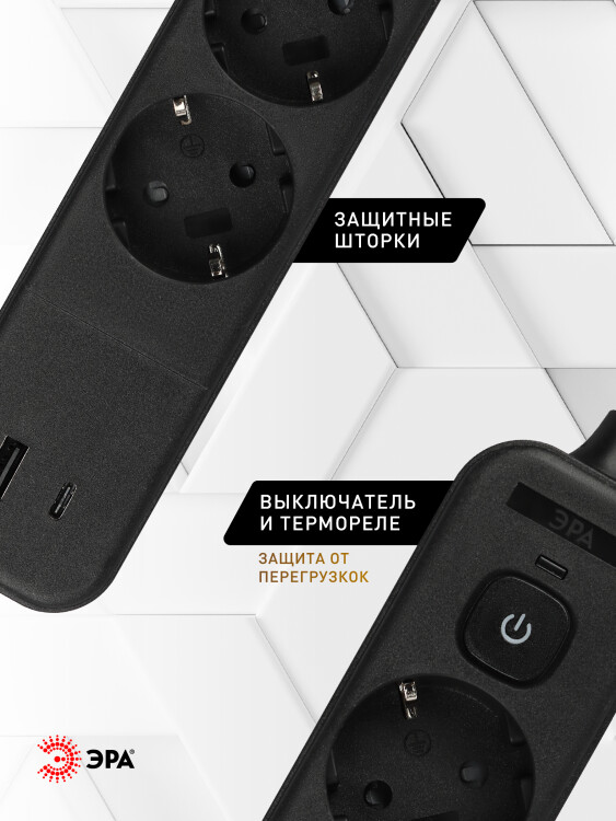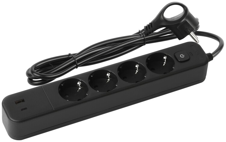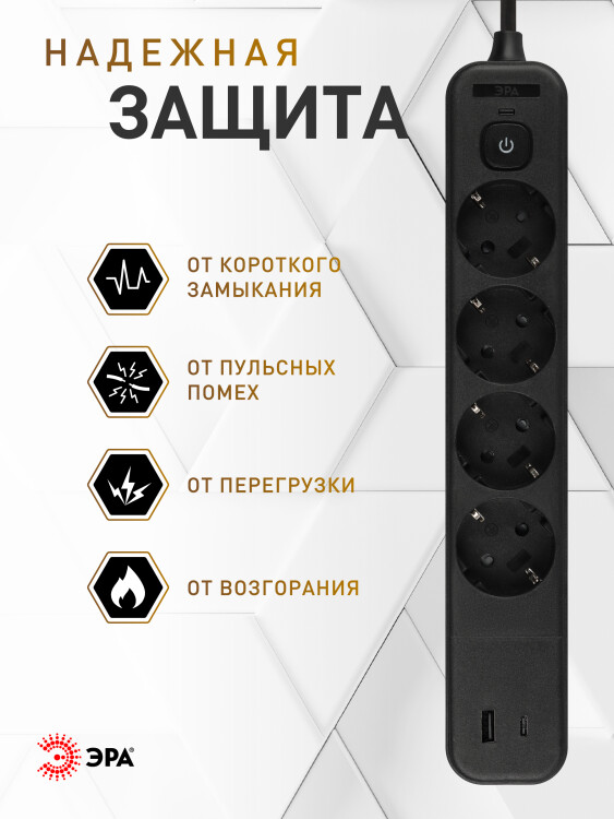 Сетевой фильтр ЭРА USF-4es-1,5m-2xUSBAC-B с базовой защитой с заземлением с выкл. 4 розетки+2xUSBA+C 2,4A 1,5м 10А