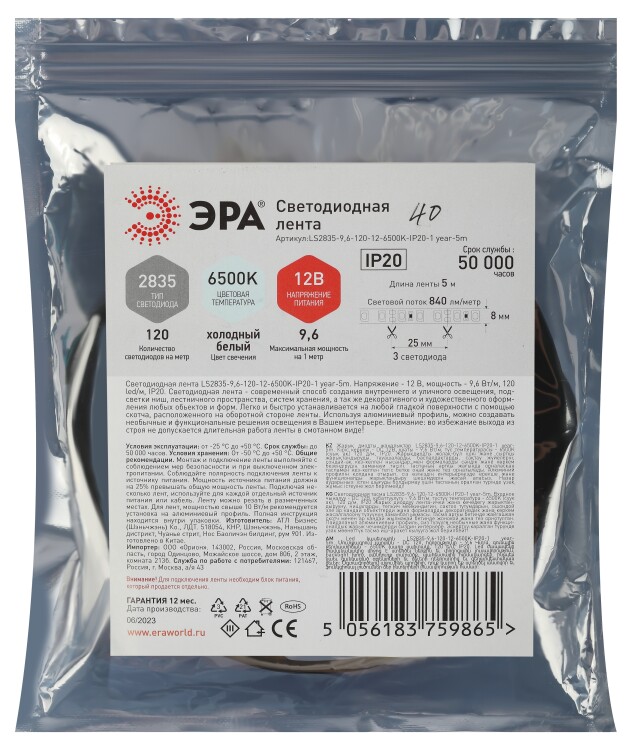 Светодиодная лента ЭРА LS2835 -9,6-120-12-6500K-IP20-1 year-5m (100/2000)