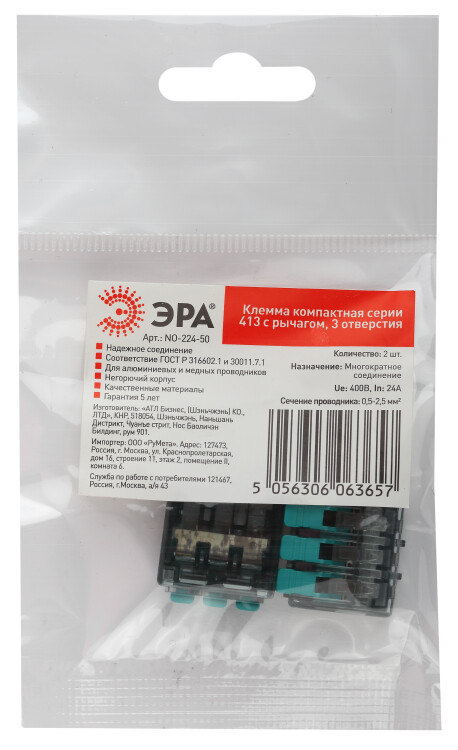 Клемма ЭРА компактная серия 413 с рычагом 3 отверстия 0.5-4 мм2 упаковка 2 шт.
