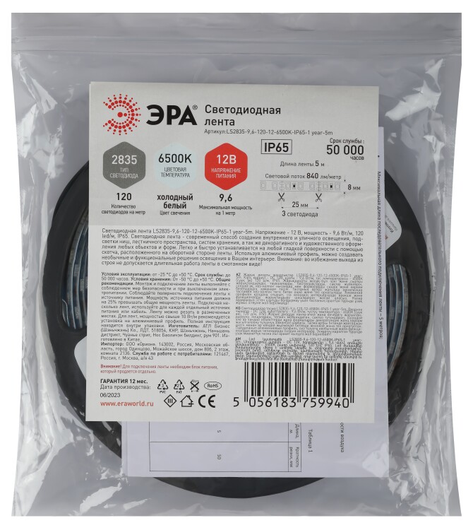 Светодиодная лента ЭРА LS2835 -9,6-120-12-6500K-IP65-1 year-5m (80/1440)