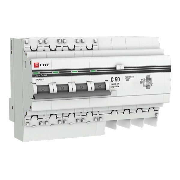 Автомат. выкл. дифф. тока 4-пол. 50А 30мА тип AC 4,5кА хар-ка C серия АД-4 50А/ 30мА (хар. C, AC, электронный, защита 270В) 4,5кА EKF PROxima