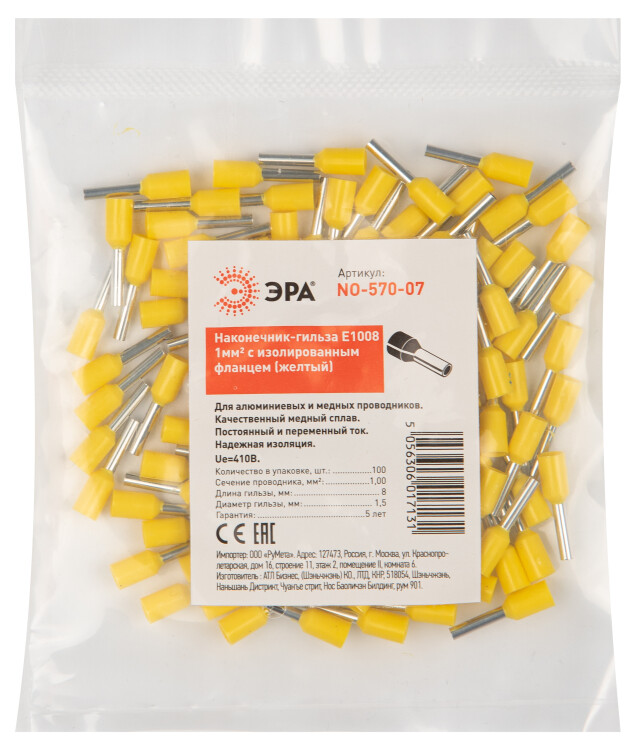 Наконечник-гильза НШВИ ЭРА NO-570-07 Е1008 1мм2 с изолированным фланцем желтый упаковка 100 шт