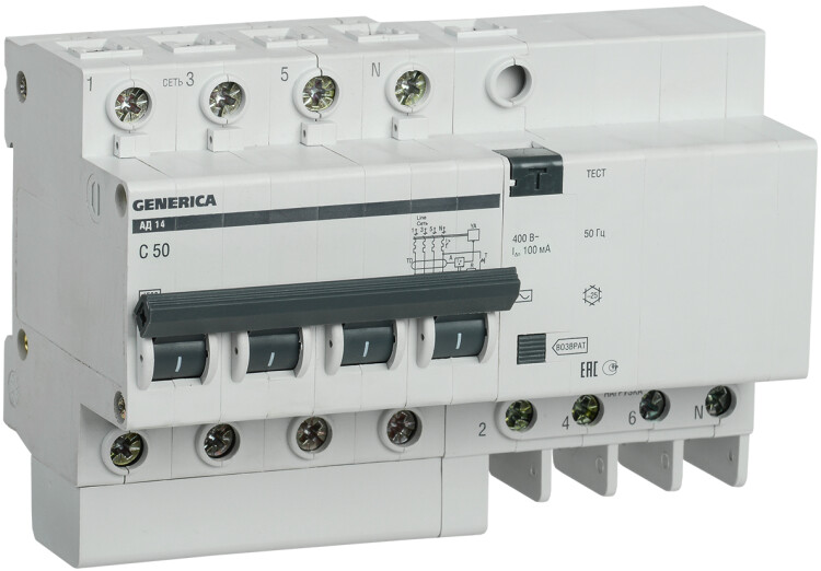 Диф. автомат АД14 4Р 50А 100мА GENERICA
