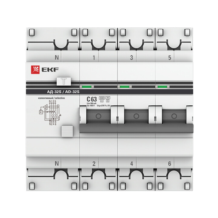 Автомат. выкл. дифф. тока 3-пол.+N 63А 300мА тип AC 4,5кА хар-ка C серия АД-32 (селективный) 3P+N 63А/300мА EKF PROxima